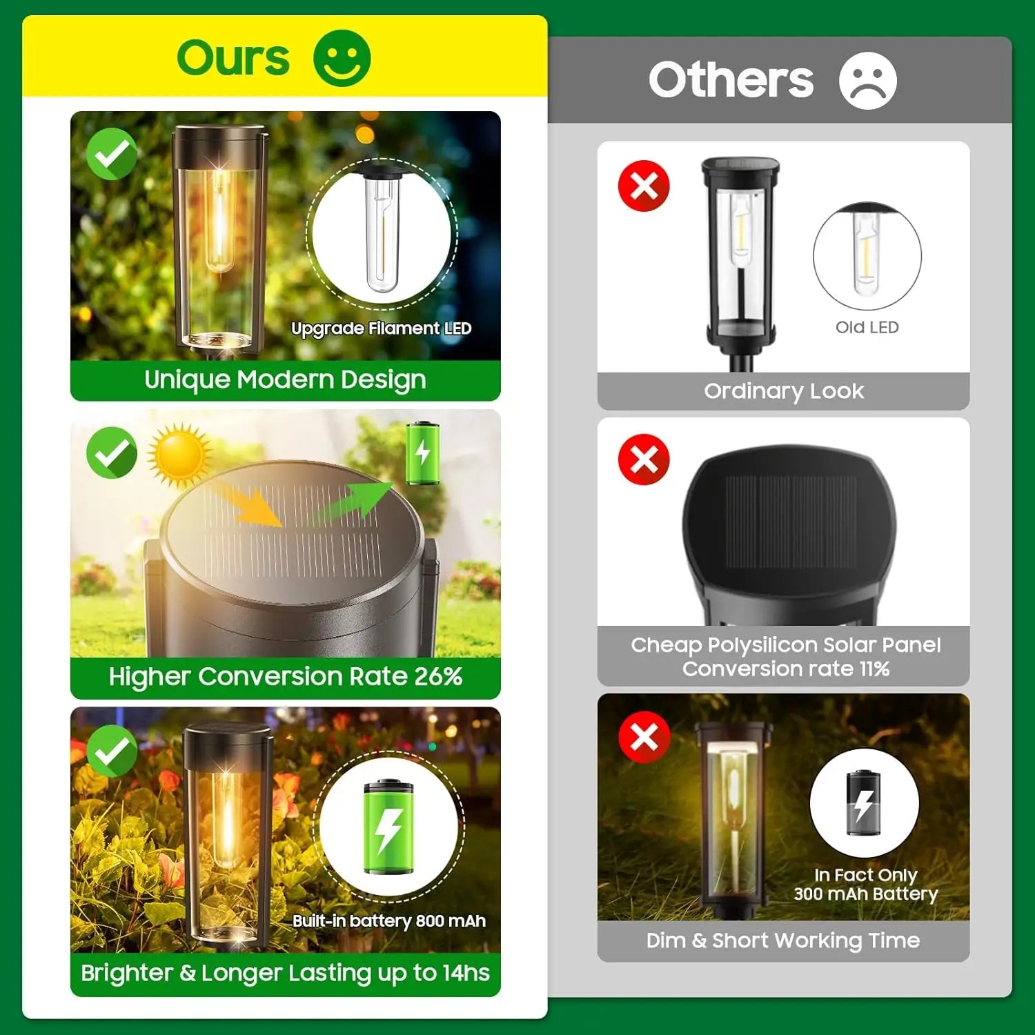BRIGHTER & LONGER LASTING: These outdoor solar lights adopt the newest lighting technology, which creates a romantic and warm atmosphere and are brighter than other solar landscape lights. Outdoor walkway lights solar powered have a larger battery capacity 800 mAh rechargeable Ni-MH. Solar pathway lights can light up to 8 -12 hours