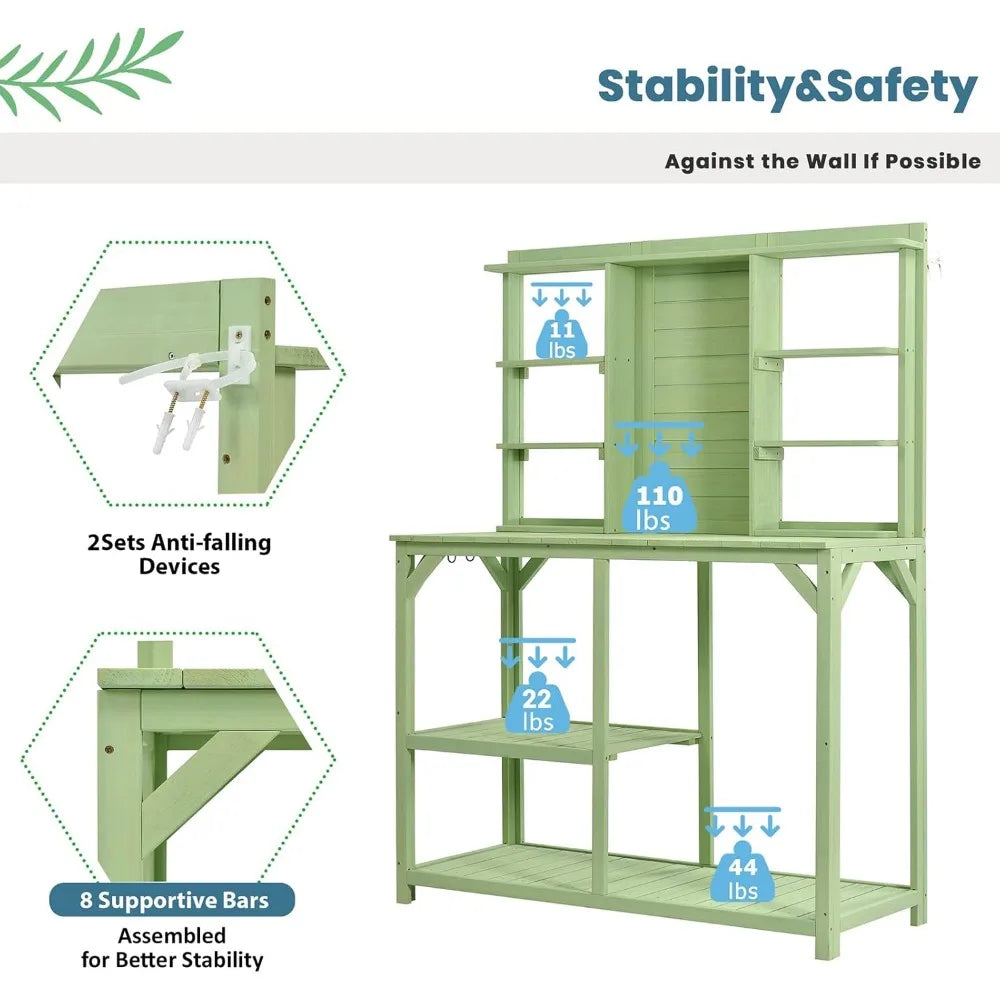 - 【Stability&Safety】For any furniture, stability and safety are the necessity even this potting table. There are 8 support bars under table top for stability and 2 anti-falling devices in the back for fixing the bench with the wall. Recommend to put the table against the wall for better safety.