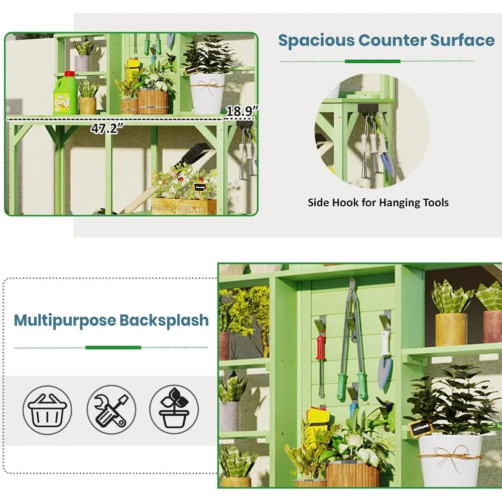 - 【Backsplash&Side Hook】There are always many small kits when gardening such as hand trowels, rakes, transplanters, towels, gloves and, of course, your farmer's hats. Just with some nails, the splash plate will become a board to hold your tools. Besides, the potting table comes with 3 hooks in the side which will make gardening easier.