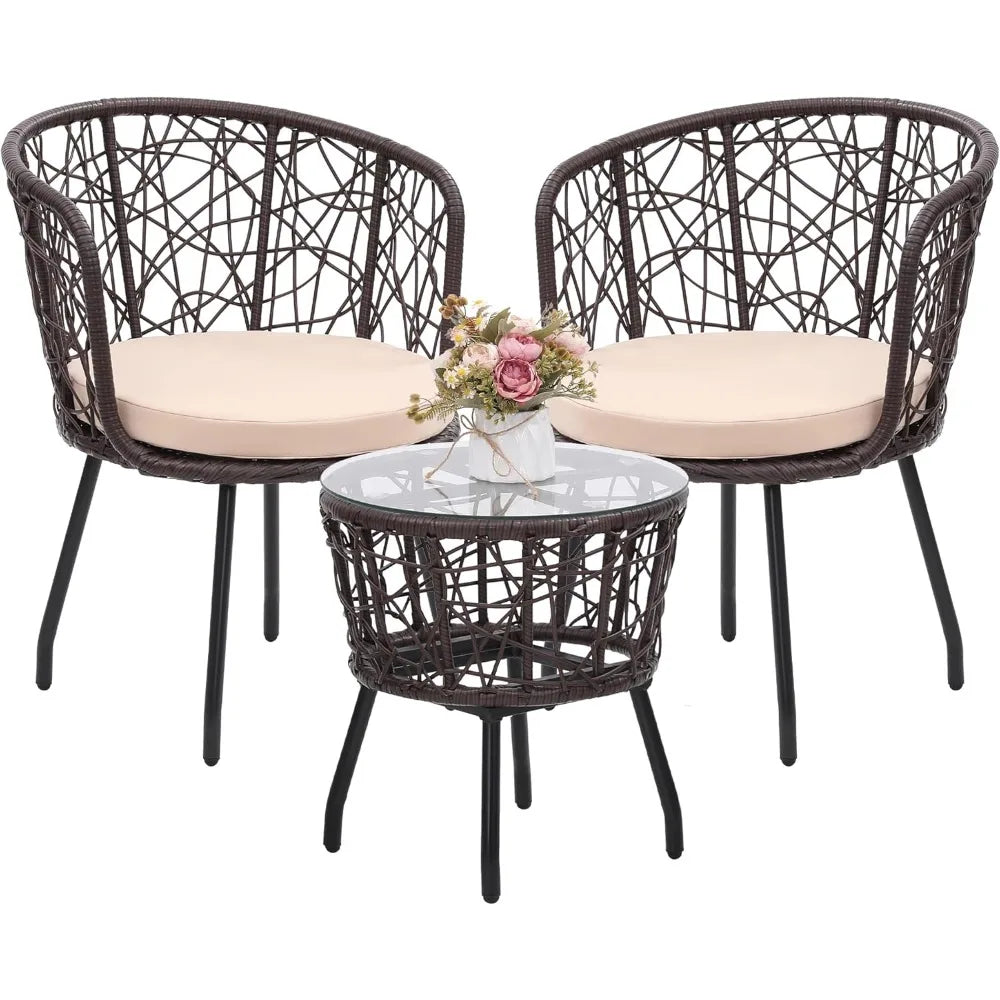 Boho 3 Piece Bistro Set, Modern Outdoor Wicker Patio Furniture with Tempered Glass Table Top and 2 Chairs, Washable Cushions, B