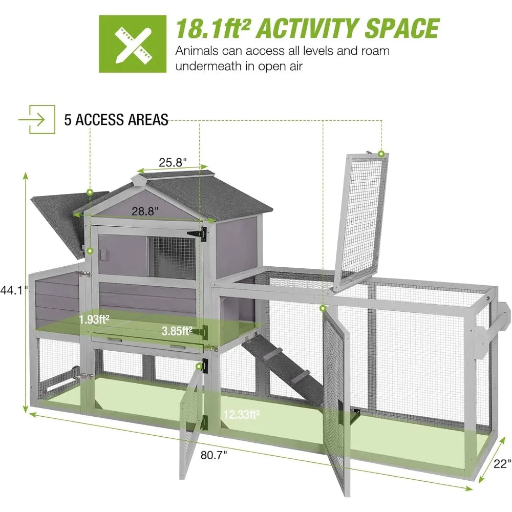 - Spaciou Space: Chicken house offers plenty of running space. 18.1ft² inner space perfect for 2-4 chickens.Overall size:80.7"(L) x 25.8"(W) x 44.1'(H).