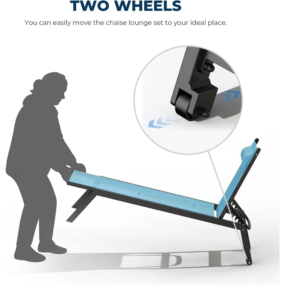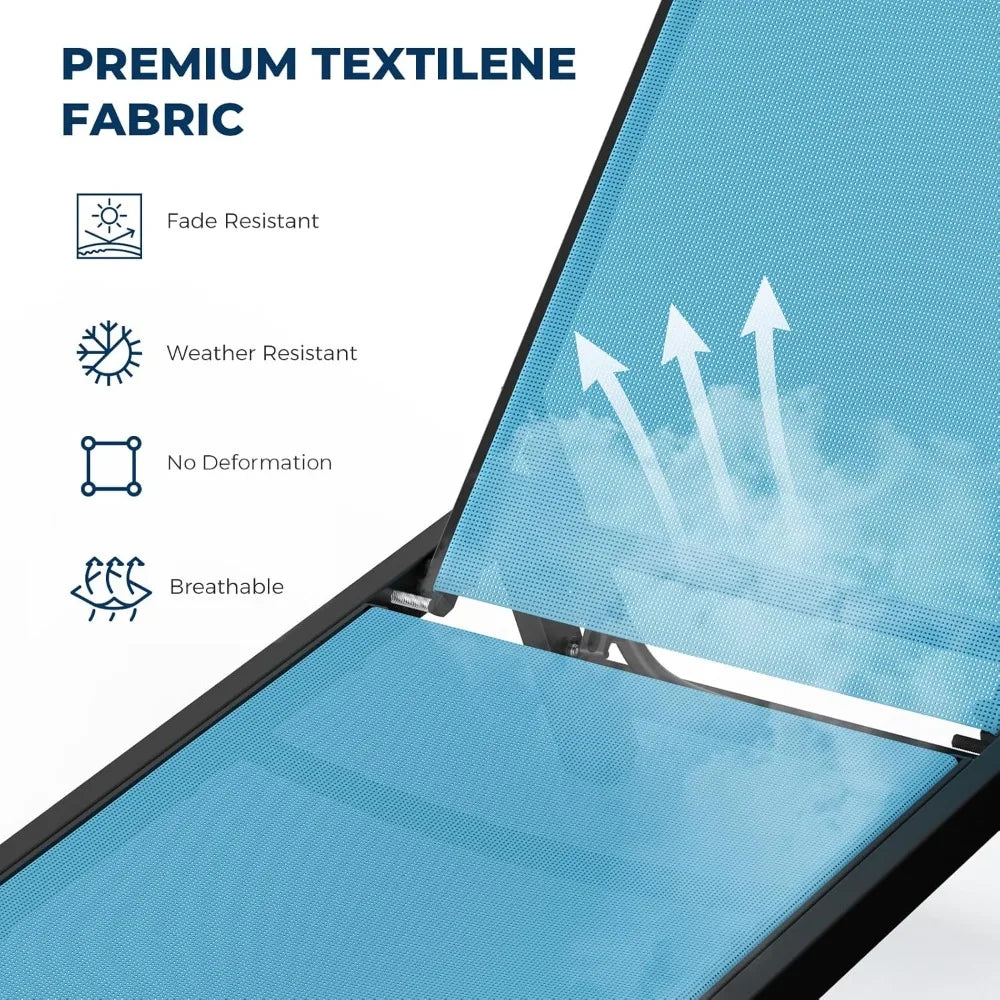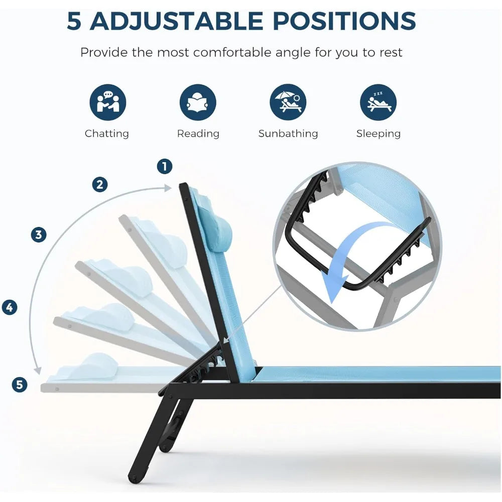 Outdoor Aluminum Lounge Chair -Set of 2 with 5 Position Adjustable Backrest, Textilene Fabric, Two Wheels, Headrest for Pool