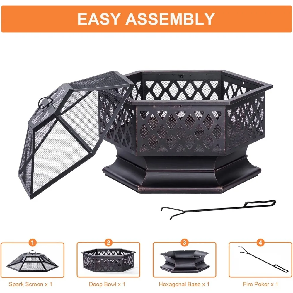 Outdoor Fire Pit, Hexagon Shaped Wood Burning Firepit for Outside Bonfire, Patio, Backyard and Camping (Antique Bronze, 33 Inch)