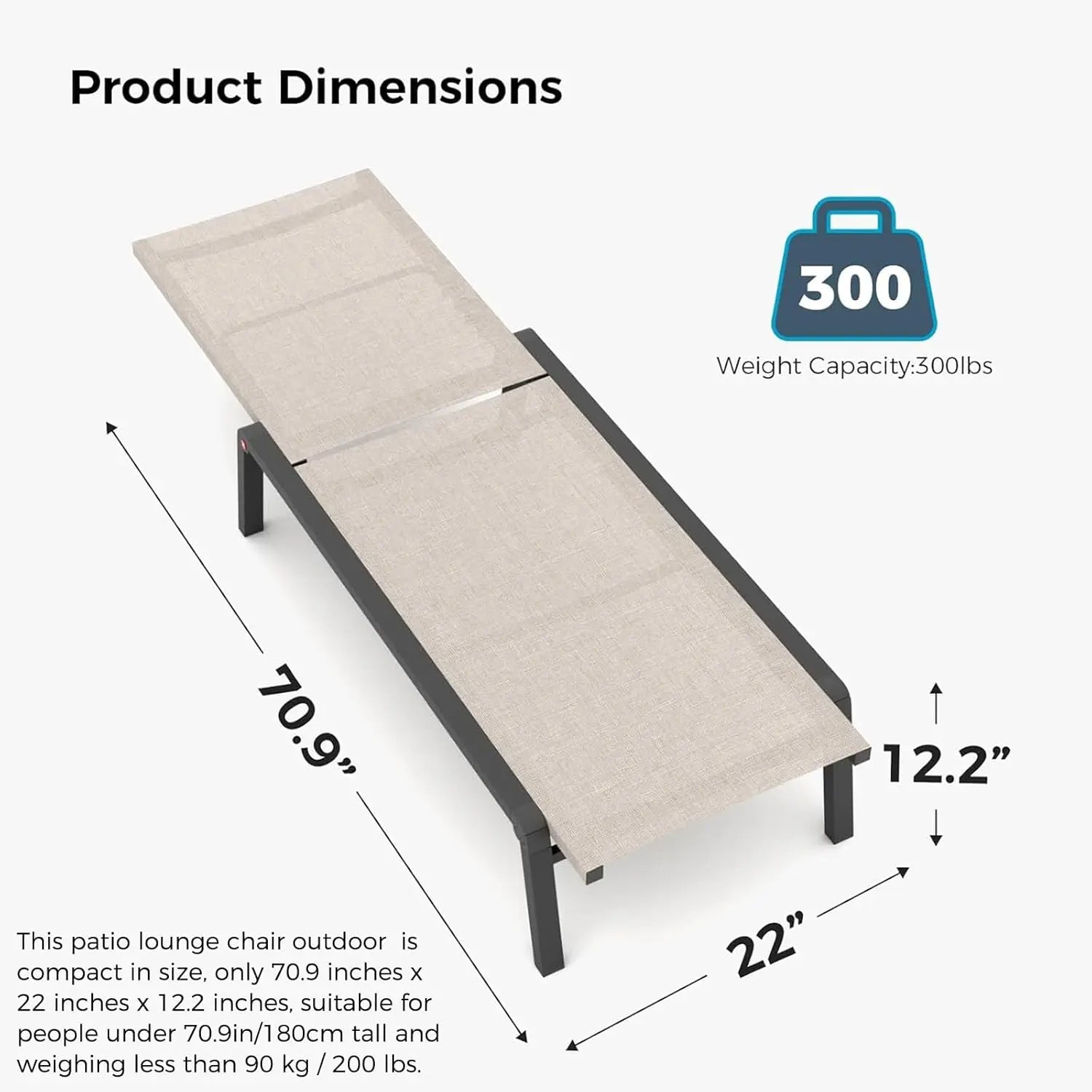 【APPLICABLE SCENARIOS】: This patio lounge chair outdoor is compact in size, only 70.9 inches x 22 inches x 12.2 inches, suitable for people under 70.9in/180cm tall and weighing less than 90 kg / 200 lbs. Whether you're soaking up the sun or enjoying a relaxing time with friends, our pool lounge chairs are perfect for your patio, porch, backyard, balcony, poolside, or garden.