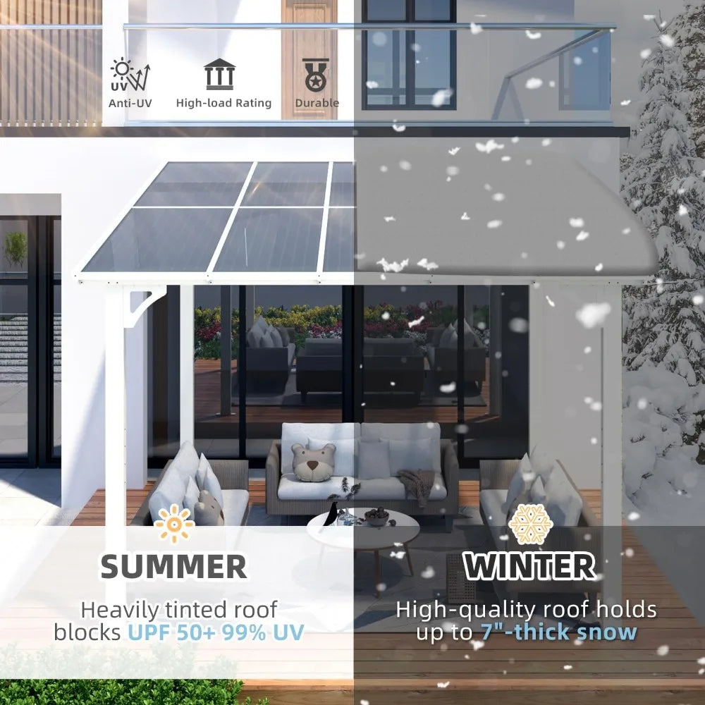 Effortless Installation: Our easy-to-follow guides, detailed manuals, and step-by-step video tutorials ensure a smooth setup. Moreover, our expert technical team is available for remote assistance at your convenience. Infinite Coverage Area: All gazebos come pre-set with extendable tracks on both sides, allowing seamless connection for larger coverage of your yard. Balancing the features of a canopy awning and a freestanding gazebo, we introduces a high-quality wall-leaning gazebo that combines the best of both worlds. Waterproof Performance: The inclined design and meticulous detailing at the top guarantee complete water resistance during our extensive 6-month outdoor testing. Durability and Stability: Rigorous static pressure tests prove it withstands 6 lbs per Sq.Ft, about 7" of heavy snow, instilling confidence in facing hail and blizzard conditions in Denver or Minnesota. Unlike traditional freestanding gazebos, it easily attaches to the wall with provided accessories, confidently withstanding winds of around 50 Mph once securely fixed and stabilized on the ground. Worry-Free Experience: We consistently back our gazebos, providing not only maintenance and replacements for the product itself but also a professional team available 24/7 to address any concerns related to installation, usage, and more.