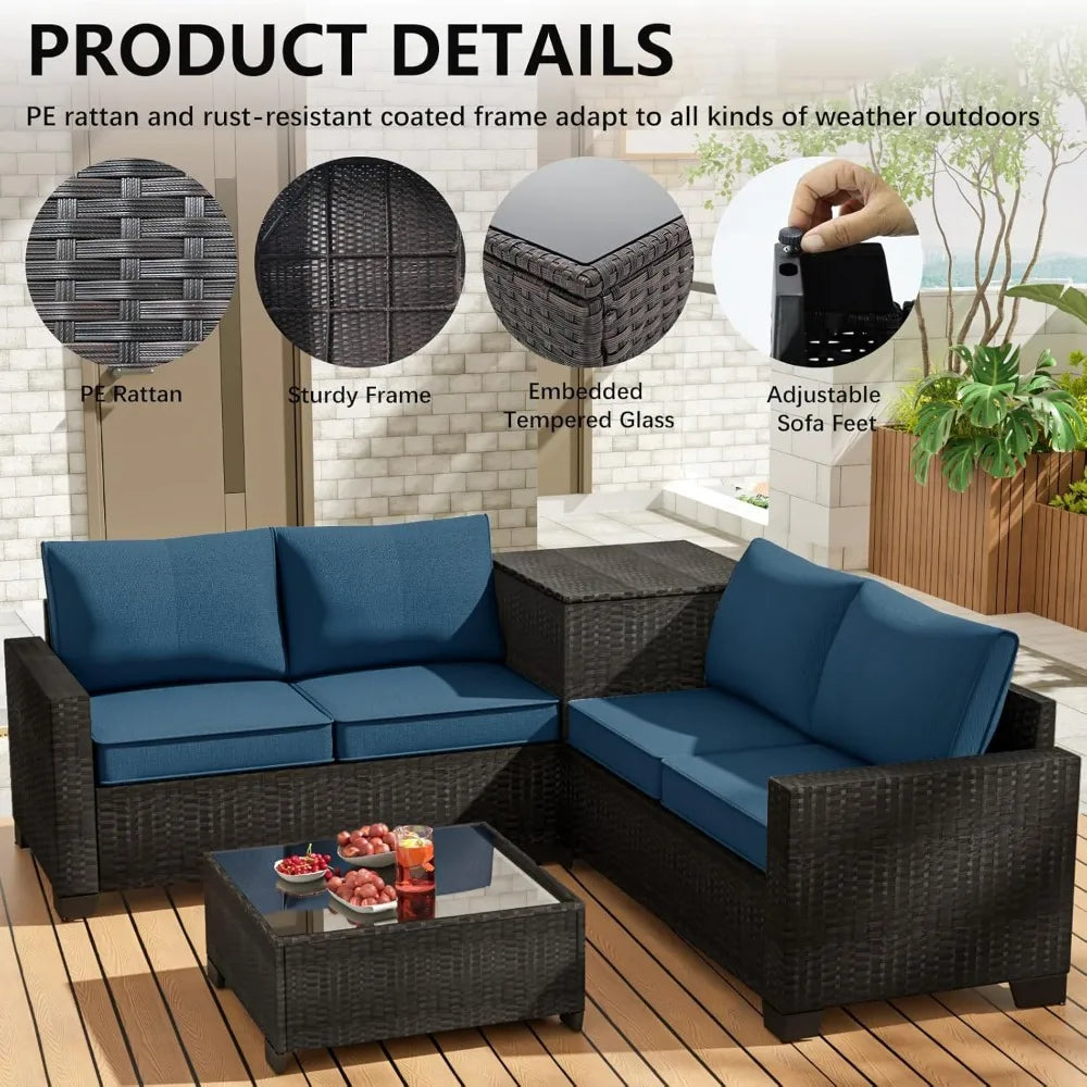 Premium Outdoor Patio Furniture Set with Storage & Glass Table, Patio Conversation Sets with Thick Cushions, 4 Piece Rattan